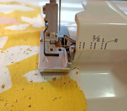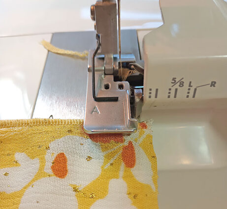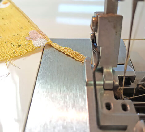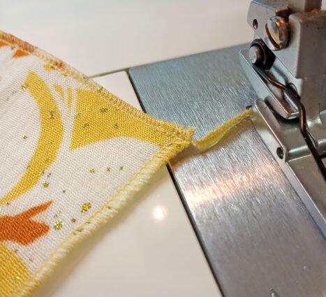 Starting at a corner, start stitching, trimming just ⅛” – ¼” from the fabric as you stitch.