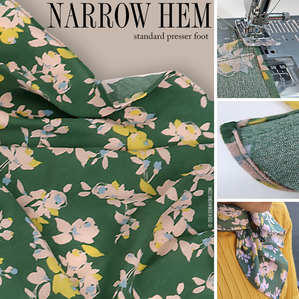- Yes, we have flipped our order and are starting the sewing instructions with the Manual Narrow Hem on the smaller square scarf. This is because you will stitch all four sides without interruption whereas there is an additional cutting step required during hemming for the Presser Foot Rolled Hem.