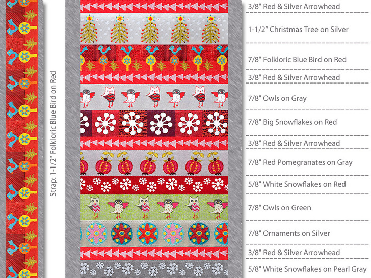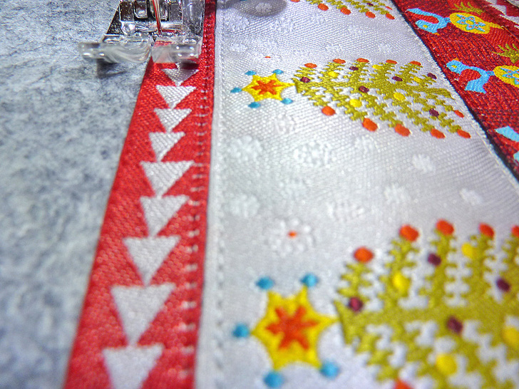 - 1 yard of 1½” wide ribbon for the strap; we were able to use the same “Folkloric Blue Bird on Red” in two sizes: ⅞” for the flap and a 1½” version for the strap – it isn’t mandatory that you use an exact match, but the base felt strap is sized for a 1½” width ribbon