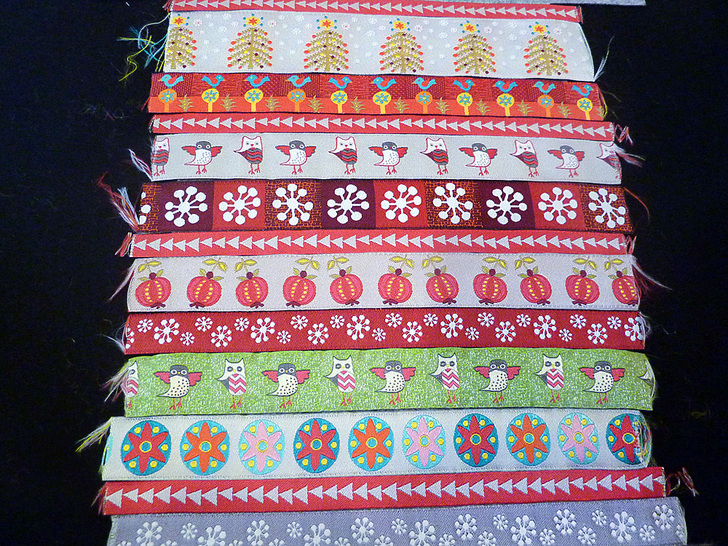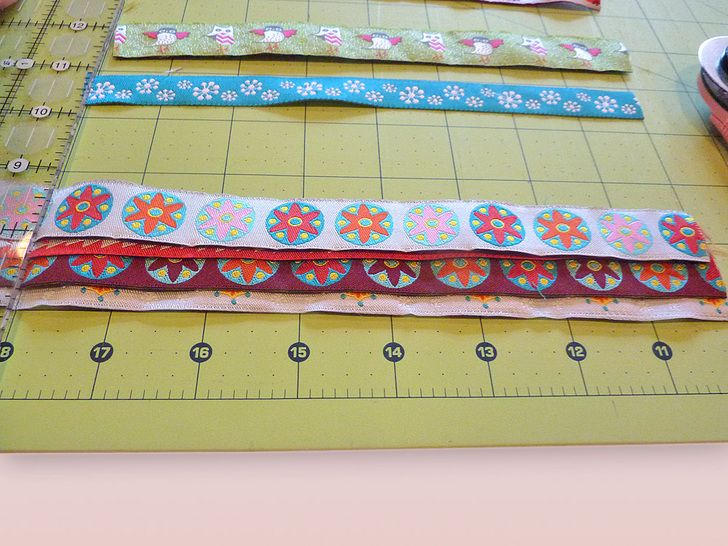 - Cut all the other ribbons into 8″ lengths, centering each so the middle 7″ best features the ribbon’s motif.