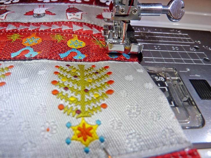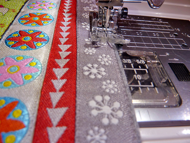 - Re-thread your machine with a contrasting thread to match the accent ribbons. We used bright red.