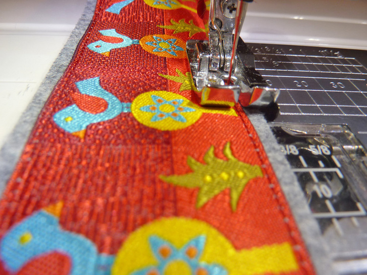 - Center the ribbon to the felt strip, press to adhere, and topstitch the ribbon in place along both sides.