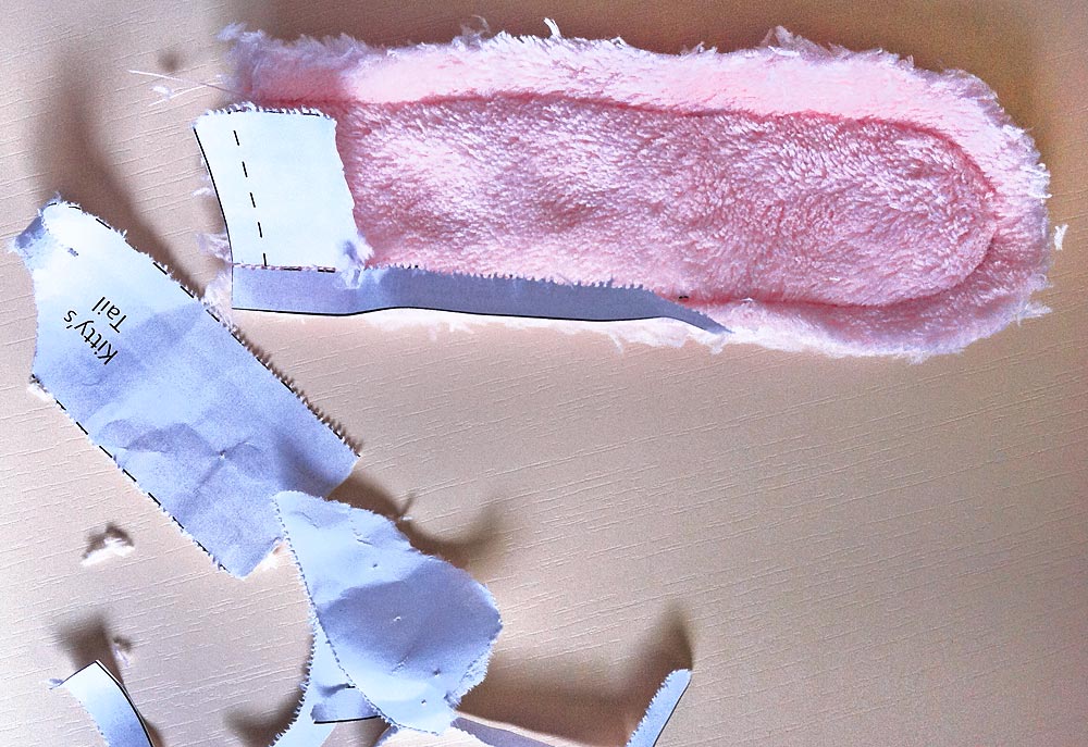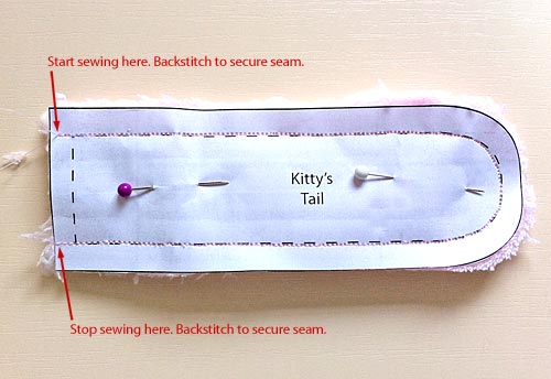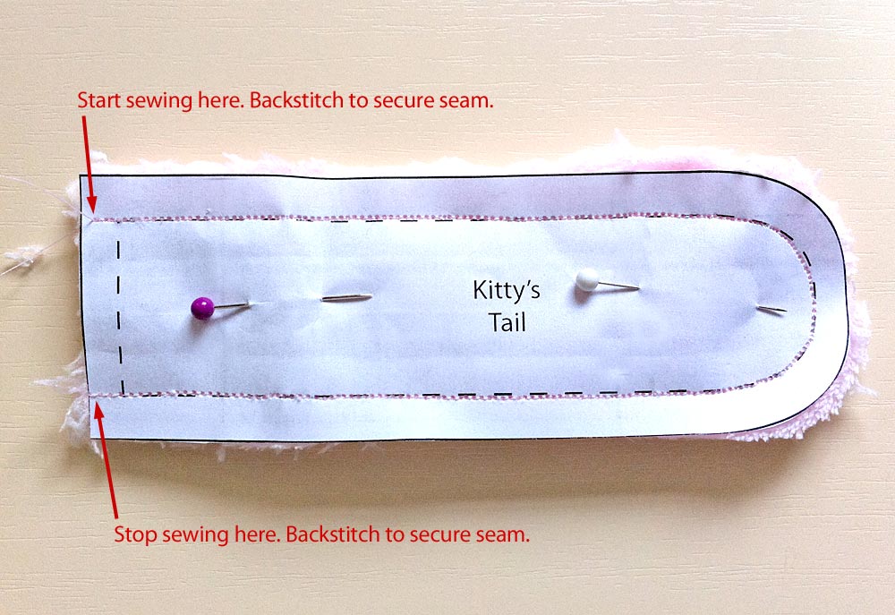 - Cut out the Kitty Tail pattern piece along the solid line. Place two scraps of fleece, just slightly larger than the pattern piece, right sides together. Pin the pattern piece to the layers of fleece. Sew from the base of the tail around the tip and back down to the base. DO NOT sew across the base. Trim along the pattern cut line.