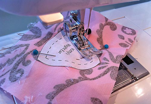 - Stitch along the dashed seam line (again – right through the paper), beginning at the marked dot on one arm. Backstitch to start, then continue along dashed seam line all around to the second marked dot. Stop at this dot and backstitch, leaving the space between the dots open for turning and stuffing.