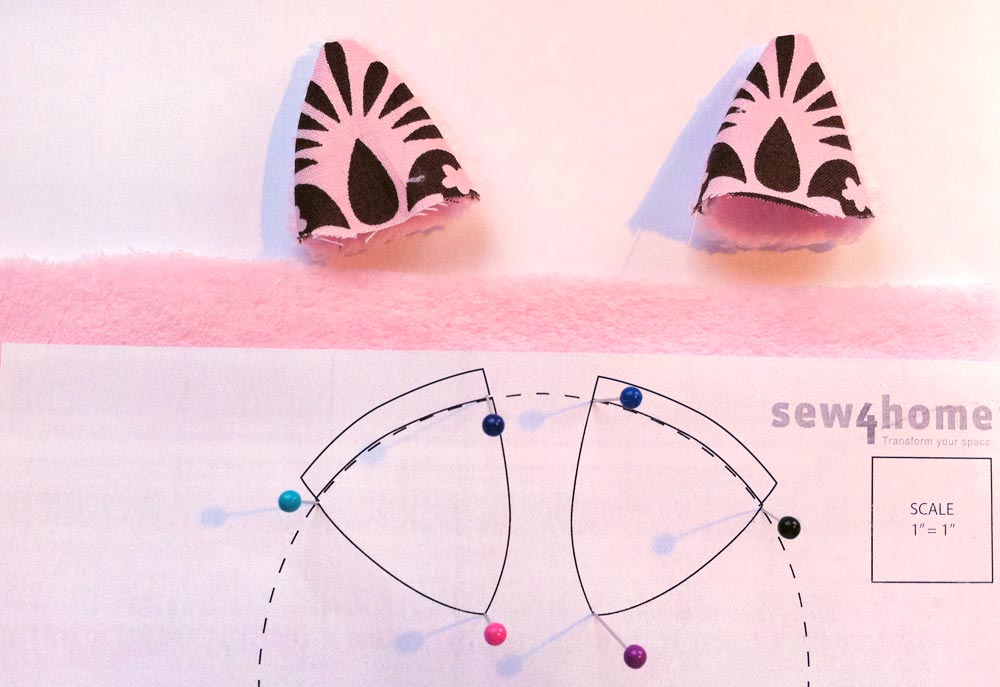 - Cut out the two ear pattern pieces along the solid line. Place one scrap of fleece and one scrap of cotton fabric, each just slightly larger than the two ear pattern pieces, right sides together. Pin the pattern pieces to the layers. We pinned with the cotton side facing up so we could center the ear patterns over an appropriate motif on the fabric for a pretty fussy cut.