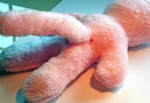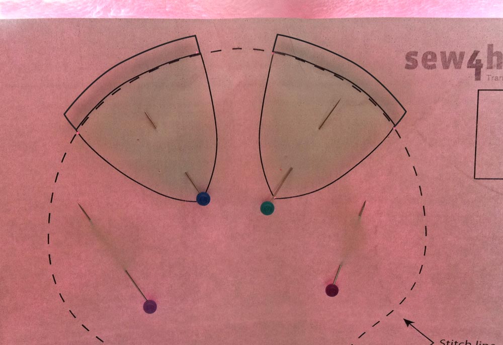 - Use the marking pins to find the corners of the ears and pin in place as shown (we held this up to a window to show positioning). Remember, the ears are pinned in position underneath the fleece.