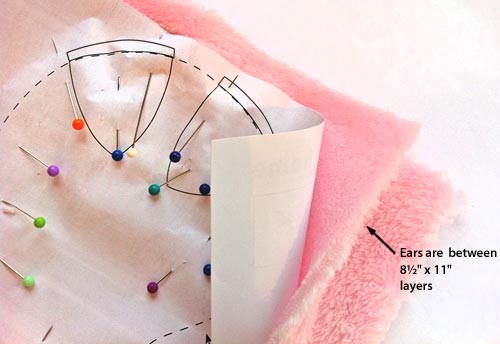 NOTE: The ears go beneath the fleece, NOT between the paper pattern and the fleece.