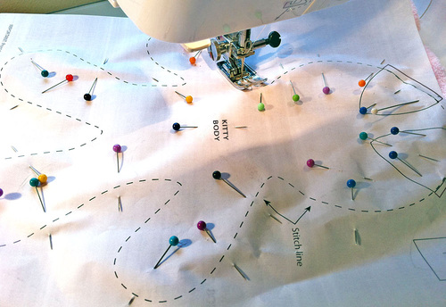 - Place the Kitty Body printout on top of the wrong side of one of the 8½” x 11″ pieces of fleece. Secure the pattern to the fleece with a few straight pins.