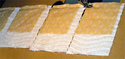 - Using a ¼” seam allowance, stitch through all layers just along the front sides of the base (that’s one half of the base piece).
