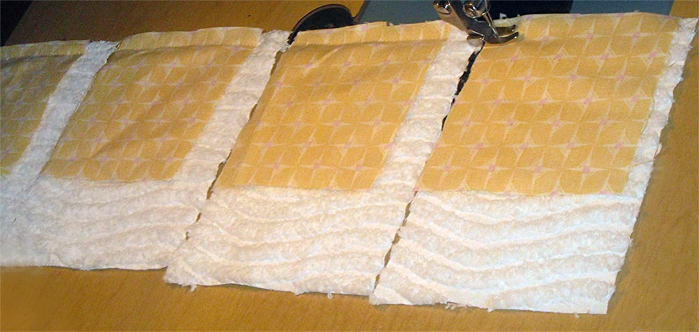 - Pin each set together along one 4″ side and stitch together, using a ½” seam allowance. As you can see in the photo below, you are aligning the smaller cotton square with one corner of the larger chenille rectangle.