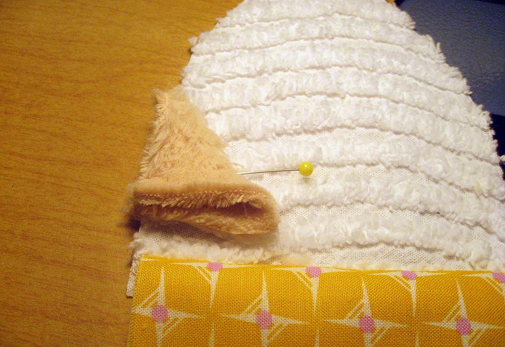 - Cut the 9″ strip of top knot fleece into three 2″ bits. Pin these three little strips to the very top of the front body piece for his top knot feathers. Hand or machine baste in place.