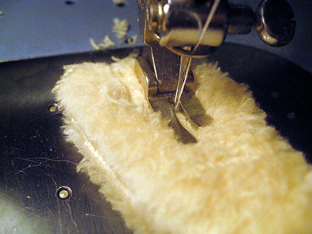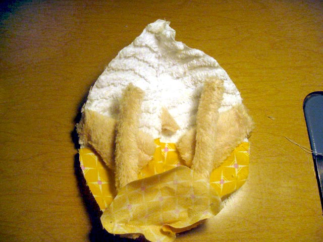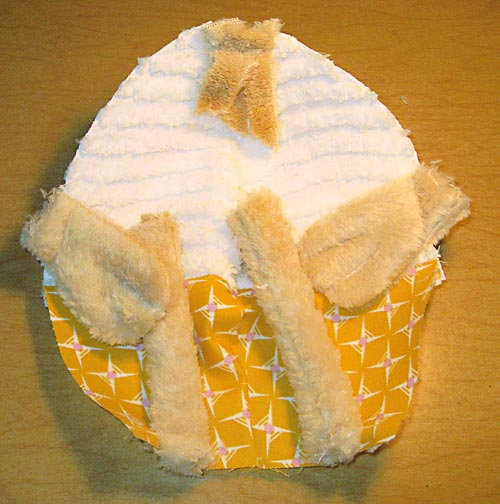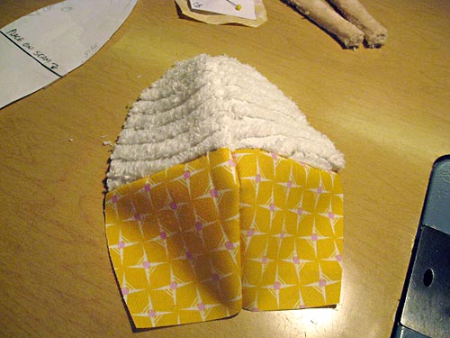 NOTE: Remember, the fleece is basically a knit fabric, so it will not fray. It will shed like mad at first, but once it stops shedding, it will be stable. The strip for the top knot and the square for the beak are simply cut to size with no seam allowance and no finished edges.
