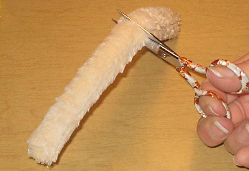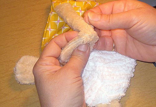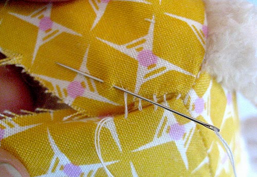 NOTE: You can fill the last inch or so with small dried beans for extra weight; this will help him sit up more securely. - Re-thread your hand sewing needle with thread to match the cotton.