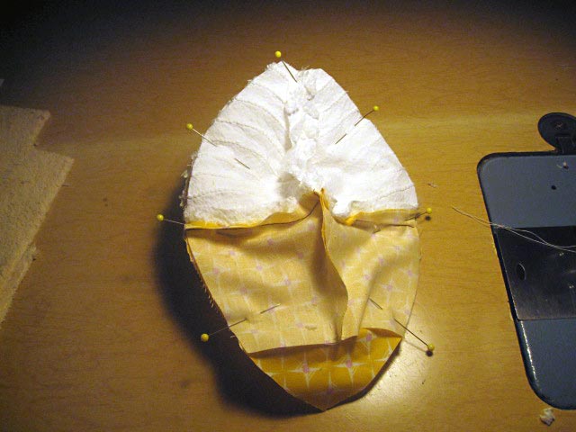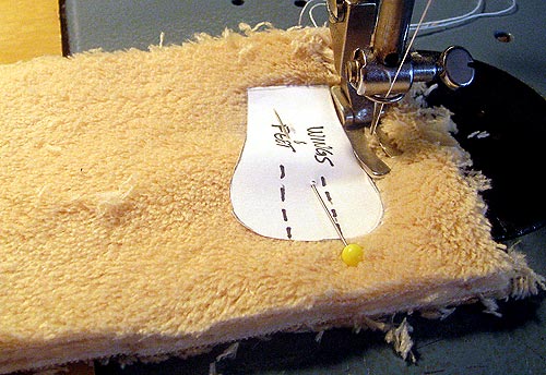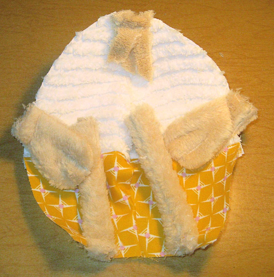 - Take all four pieces back to the swing machine and topstitch two short (about 1″) lines from the outer curved edge of each towards the raw open end. These are Eggy’s ‘fingers and toes.’