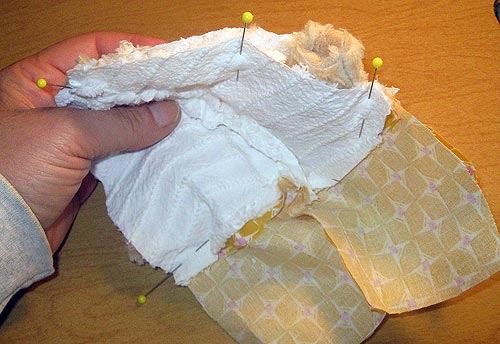 - Pin and stitch the legs to the bottom edge of the body, referring to the photo below for placement. Pinch the tops of the legs flat and roll the tubes so the seam is centered at the back of each. When pinning the legs in place, the smooth side is the right side to be placed against the right side of the cotton, which means the seam side is facing up as in the photo below. Hand or machine baste in place.