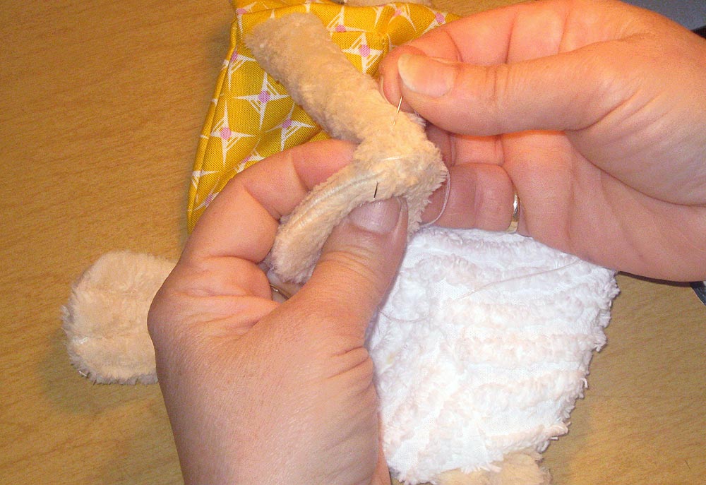 - Find Eggy’s feet. Tuck the raw edge of one leg inside the back of one foot, making sure his feet are pointing up! Also tuck in any remaining raw edges on the back of the foot. Pin in place if necessary.The fleece is nice and plush and will cover up all necessary tucking and stitching. Hand stitch Eggy’s foot securely in place.