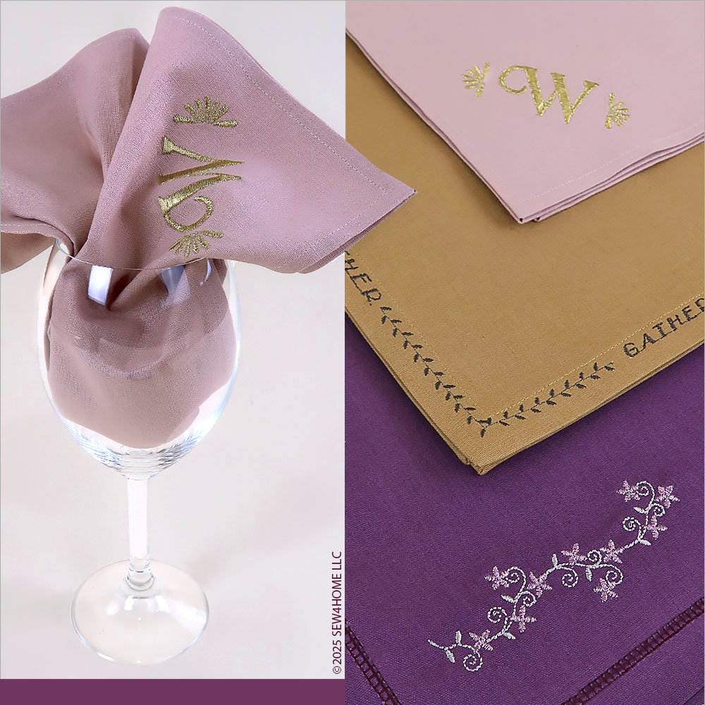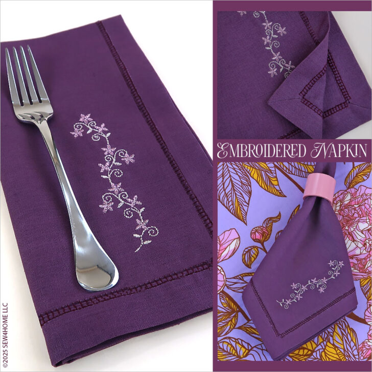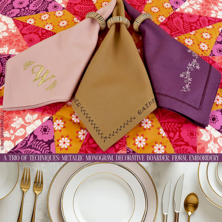 Try one technique or experiment with all three. One of the best things about sewing is the ability to learn something new or simply refresh a skill you’d forgotten about. Napkins are one of the easiest projects to complete, so adding a bit of embellishment is a wonderful way to make them special. A set of fancy napkins is also a wonderful gift idea!