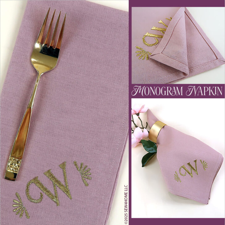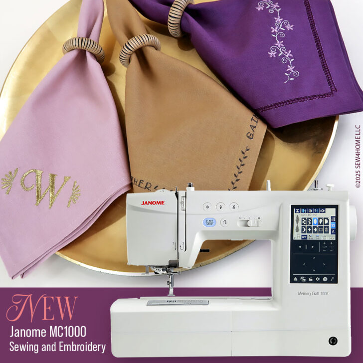 We’ve created three unique napkin designs to start you on your way to an insta-worthy table top. To execute the designs, we had fun – and success – using the new Janome MC1000 sewing and embroidery machine, putting it through its paces for ordinary sewing, decorative stitching, and machine embroidery. Although the techniques shown here are doable on many different machines, we show specifics for the MC1000. And, we encourage you to visit a local Janome America dealer in your area if possible for a full test stitch on this powerful, affordable model.