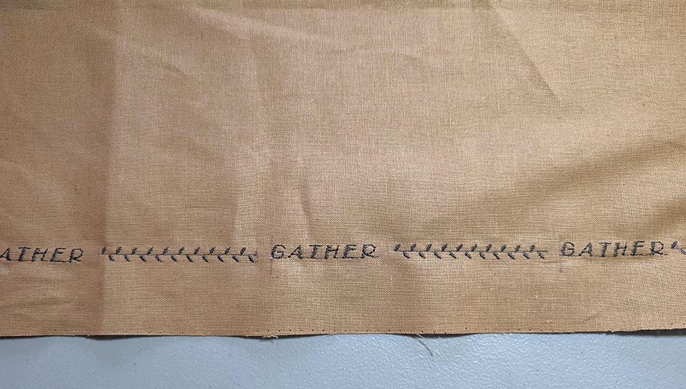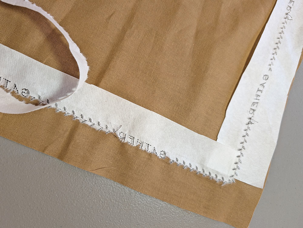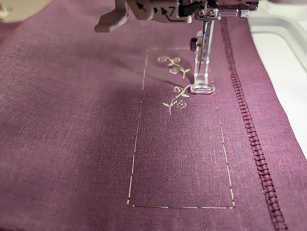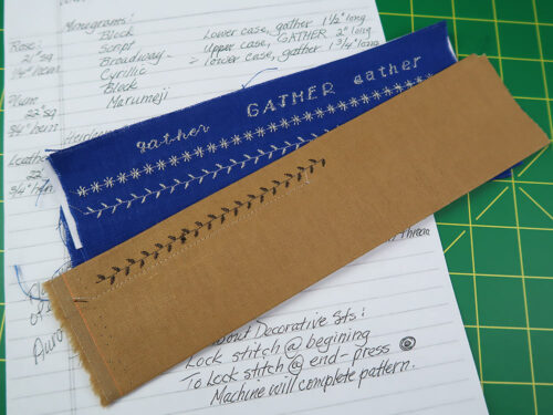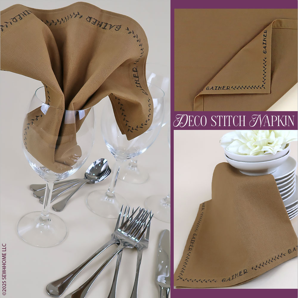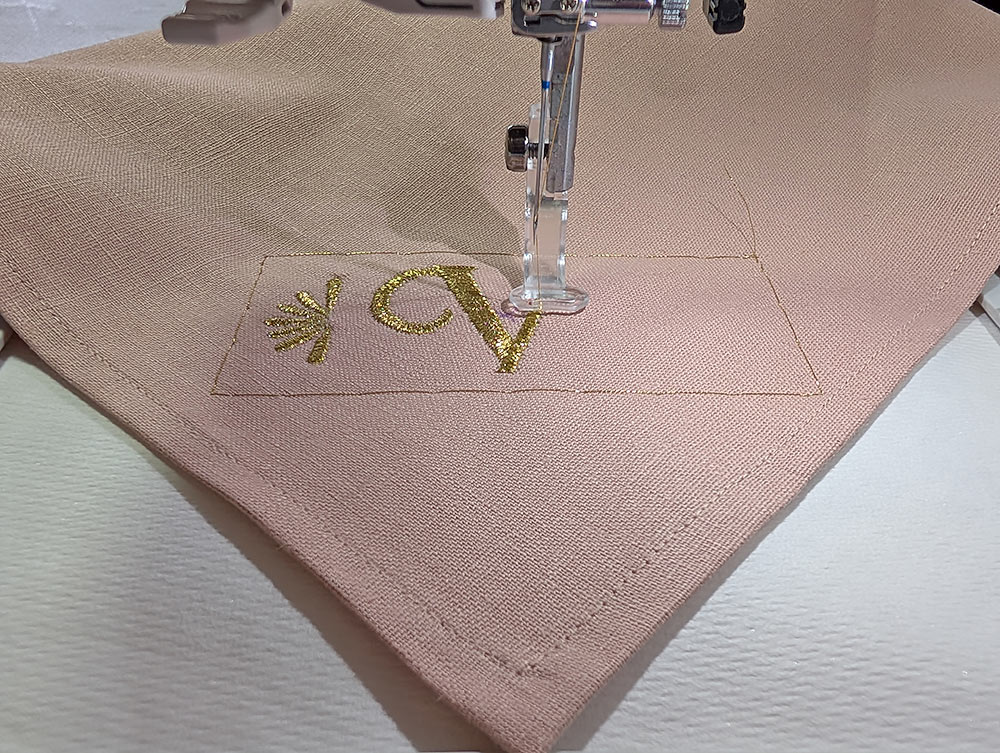 - Our napkin design called for a line of decorative stitching broken up by lettering spaced evenly around the outer edge. We did a number of test sews before selecting both the decorative stitch as well as the lettering font. As we mentioned above, you really, really, really have to test in order to get the best finish.