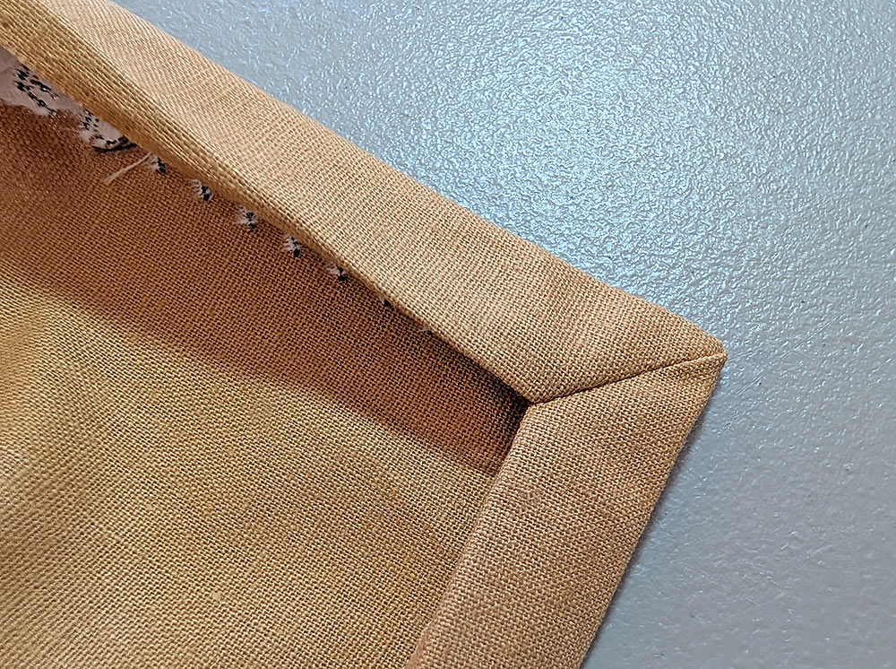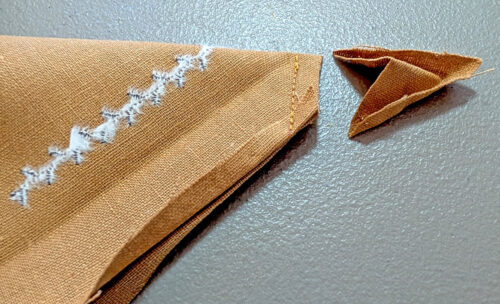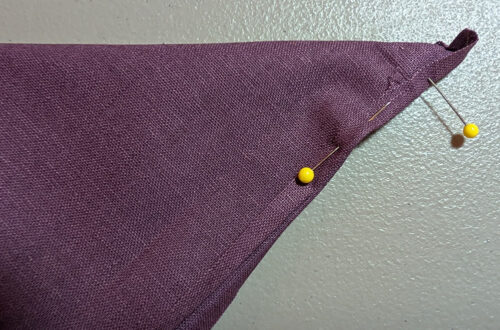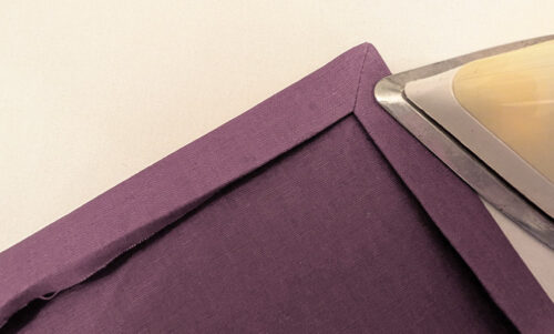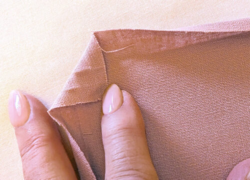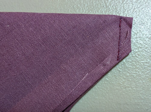 - The hem on the Leather napkin is done in the same manner as above for the Plum napkin. We’ve summarized the steps again here; you can refer to the more detailed steps above and can also check out our full step-by-step tutorial on mitered corners.