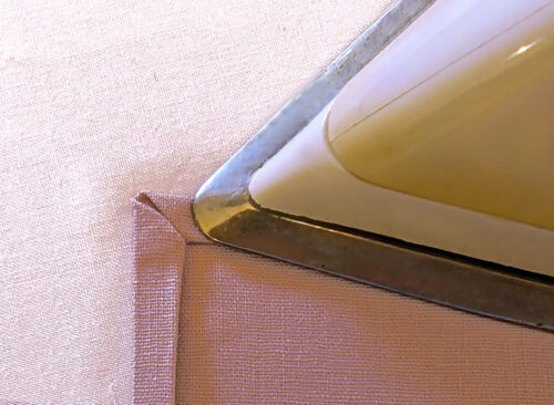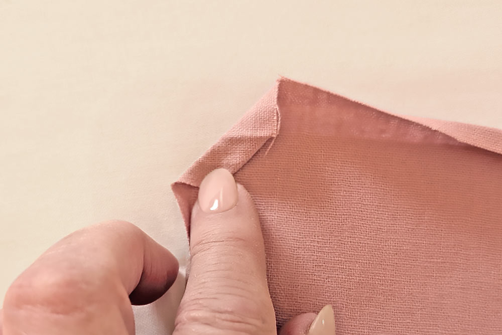 - Re-fold the sides along the second set of crease lines and press well (the outer ¼” fold). Then re-fold along your first set of crease lines and press well (the inner ½” fold). These two re-foldings will create a diagonal line where the two finished edged meet, making a very pretty corner.