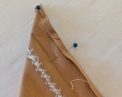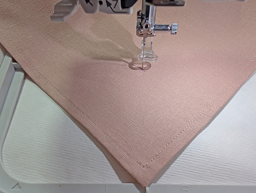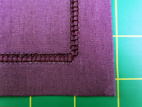 - Start the hemstitching at a corner. The goal is to catch the edge of the hem with the right swing of the needle, with the left swing of the needle going into the single layer of napkin fabric.