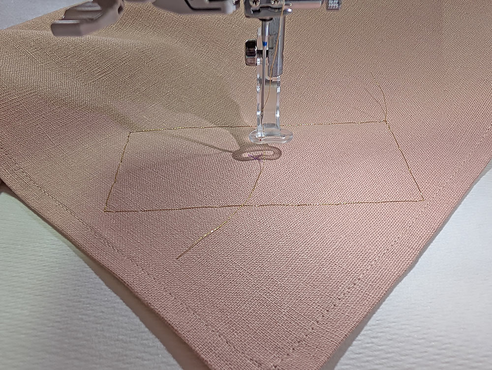 - Place the marked napkin under your presser foot then slide a strip of stabilizer underneath so it is sitting under the marked guide line. Start in one corner, adjusting your placement so the needle drops in at the exact intersection of the corner markings.