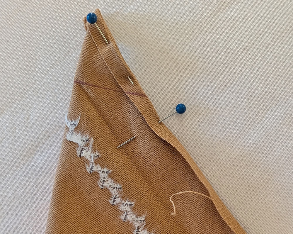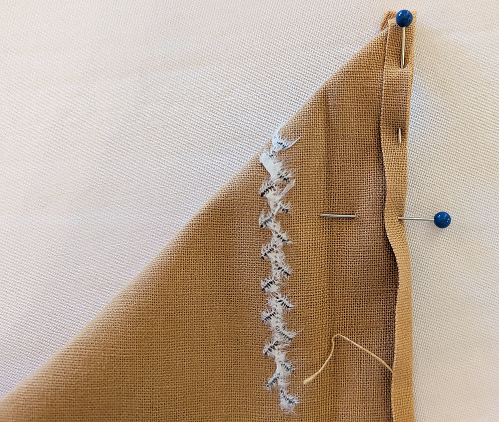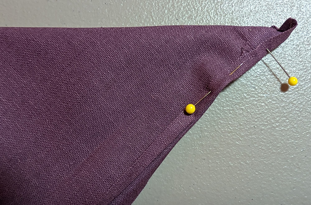 - Flip each corner in the same manner. Press the hem in place all around and pin.