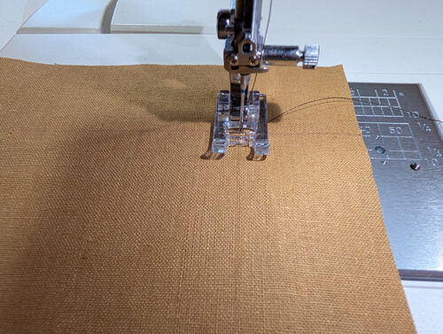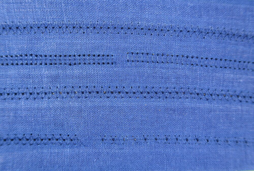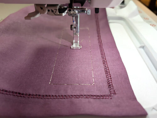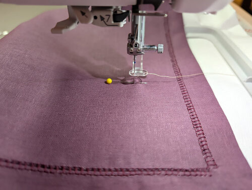 - As you stitch slowly along the first side of the napkin, watch the steps of the needle as it forms its stitch pattern.