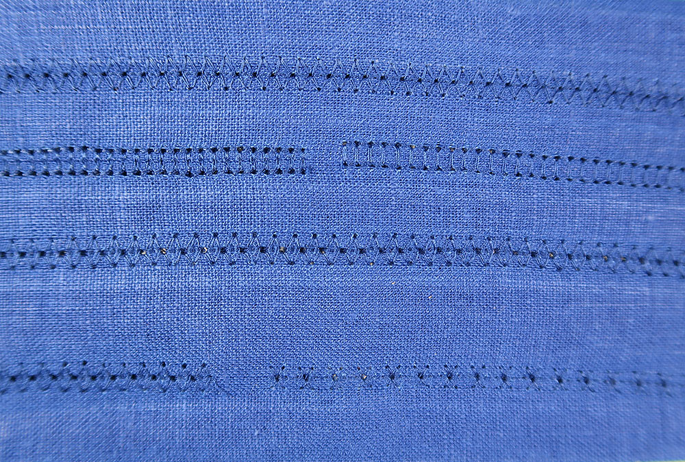 - We used a 100/16 Wing needle for the hemstitching and selected a decorative stitch from the group of Heirloom Decorative Stitches available on the MC1000. We did a number of test sews before selecting Stitch #6. We cannot recommend strongly enough how important it is to test, test, and test again when working with decorative stitching. The photo below shows a few of our attempts to get just the right look.