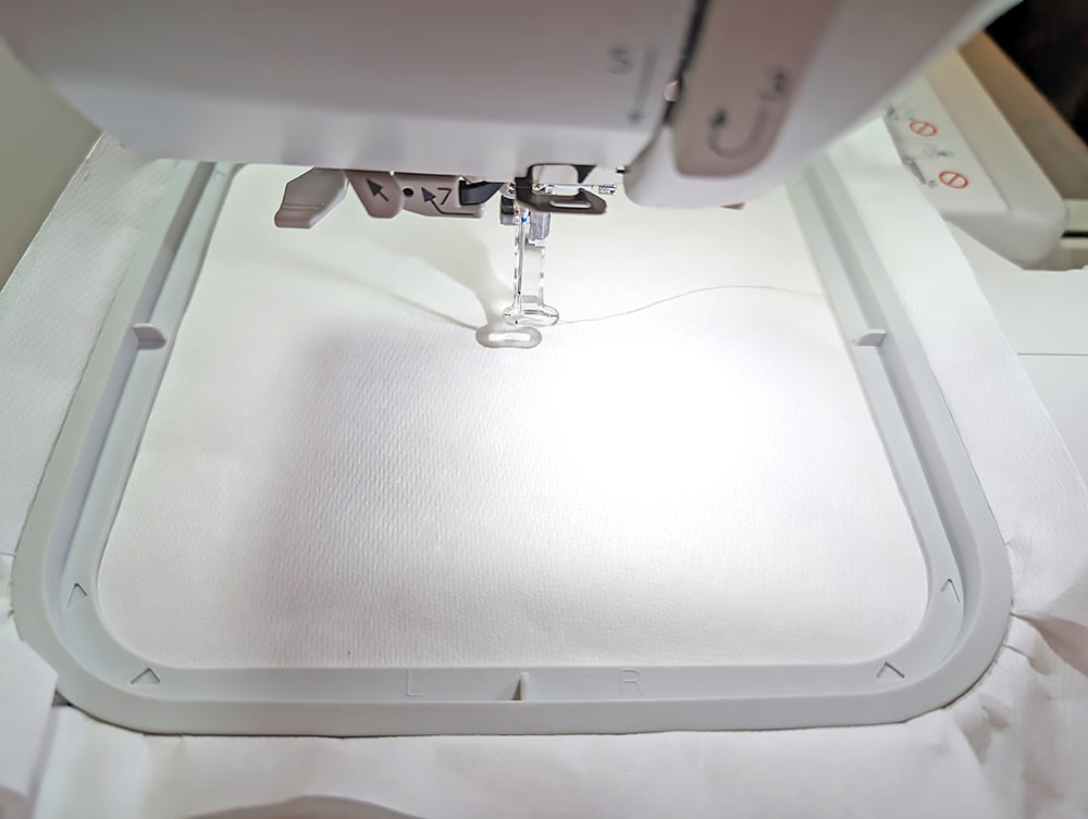 - With the design ready to go, place stabilizer in the hoop. We used two layers of a wash away stabilizer. Place the hoop on the machine. Hooping the stabilizer instead of the fabric itself is the best practice when adding a small bit of embroidery in a specific area. We love how easy it is to use the compact, swing-out-and-lock embroidery arm on the MC1000.
