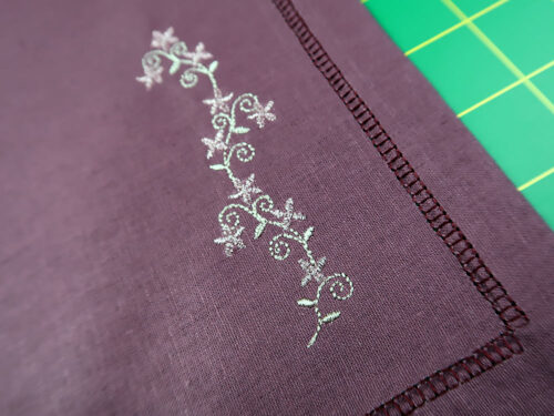 - The Plum napkin has a ¾“ true mitered hem with a hemstitched finish. One corner features a embroidery arrangement, which we created using one of the small built-in floral designs available on the Janome MC1000.