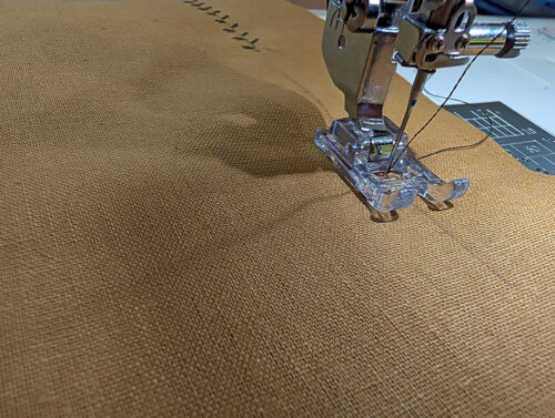 - Re-thread the machine with all purpose thread to match the fabric in the top and bobbin. We switched back the the MC1000’s Yellow Dot Bobbin Case.