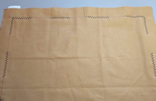 - Mark start/stop lines for the placement of the lettering. Our lettering measured 2”. To that we added a ½“ for spacing for a final measurement of 2½“. We first marked a 2½“ space at the center of each side of the napkin. We then marked a 3” space for the decorative stitching to either side of the lettering, and another 2½” space closer to each corner. This pattern insures each side will have three centered words with decorative stitching to either side, and it leaves the corners free for the final decorative stitching. The length of stitching around each corner can vary slightly to make the best/easiest turn without impacting the overall spacing along each side.