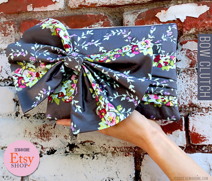 Our pretty little purse with its big, bold bow makes a dynamic fashion statement. And, the unique slip-through pleated band is a very clever way to clutch this clutch. Simply slide your hand behind the band and grab onto the bottom of the pouch to carry. It’s an exclusive pattern in our S4H Etsy Shop.