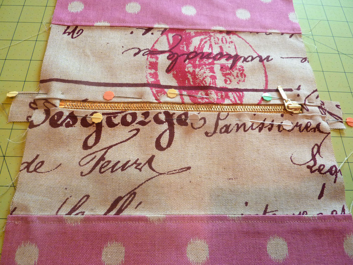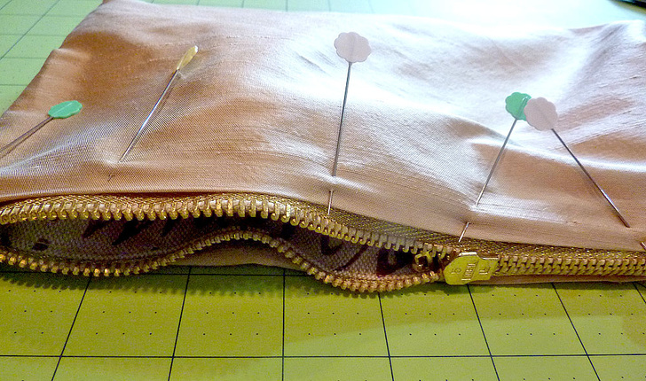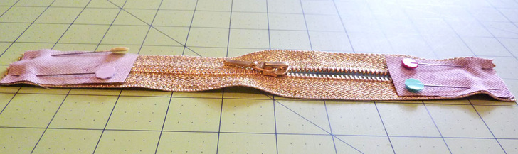 - Pin both panels in place. The folded top edge of each panel should be approximately ¼” away from the zipper teeth. Make sure the zipper is centered between the two panels. The zipper tabs will extend beyond the raw edges of the panels to either side.