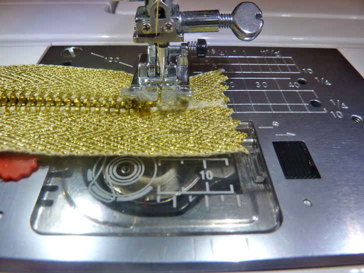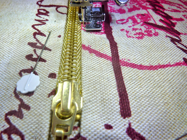 - Go slowly. When you can start to feel you’re approaching the zipper pull, stop with your needle in the down position. Twist your fabric around slightly and carefully close the zipper. Re-position your fabric and finish sewing to the end. Be very careful and go slowly; you want your seam line to be super-duper straight.