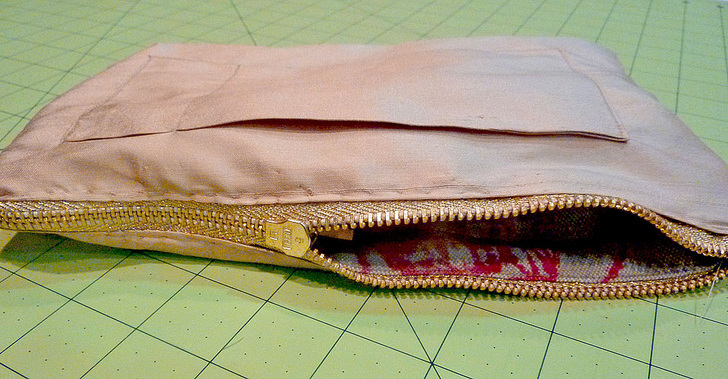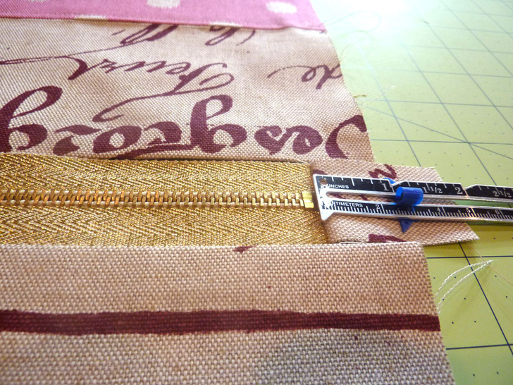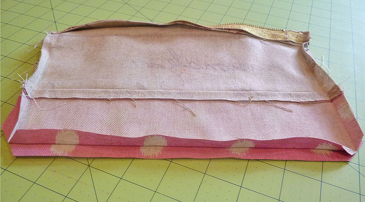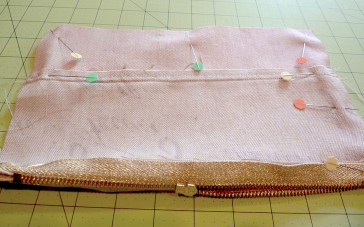 - Align the bottom and side seams. The top folded edge of the lining should fall below the zipper teeth by about ⅛”. If it doesn’t, adjust the fold to fit and gently re-press.