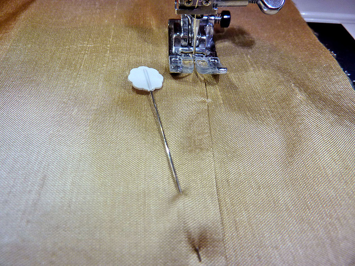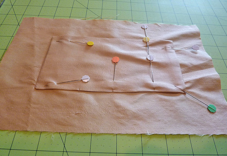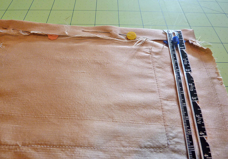 - Pin in place along the sides and across the bottom. Then, measure 1½” in from the right side of the pocket and mark a vertical line with pins or draw a line with a fabric pen or pencil (you are working on the right side of the silk fabric, so make sure your marking will easily wipe away or vanish with exposure to the air or the heat of an iron). This vertical line will be stitched to divide the pocket into two sections.