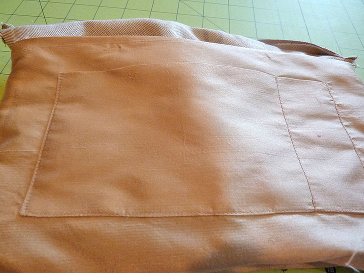 - Pin the pocket in place on the right side of one lining piece. The pocket should be centered side to side, 1½” down from the top and 2″ up from the bottom.
