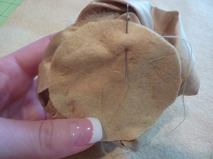 - Find the felt circle. Sew the back of the finished rose to the felt circle. Again, don’t stress about the look of your stitches; you’ll never see them.