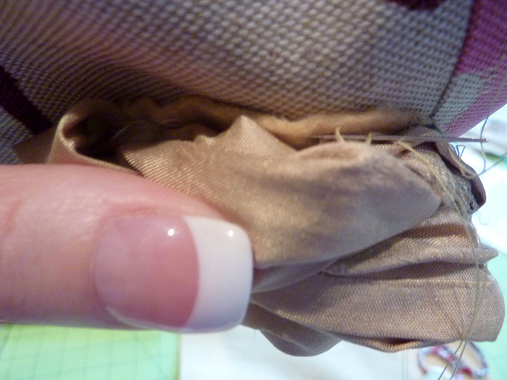 - When finished, we used a threaded hand needle to tack the back in place. Your stitches don’t have to be pretty; they’ll all be hidden.
