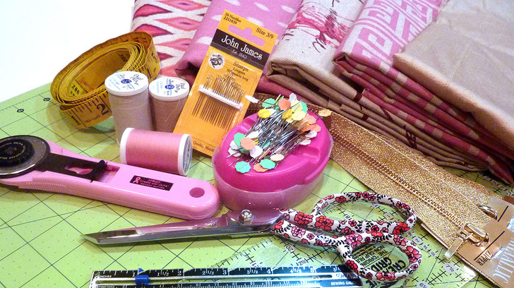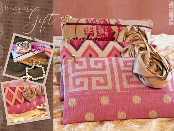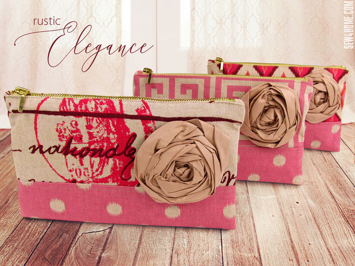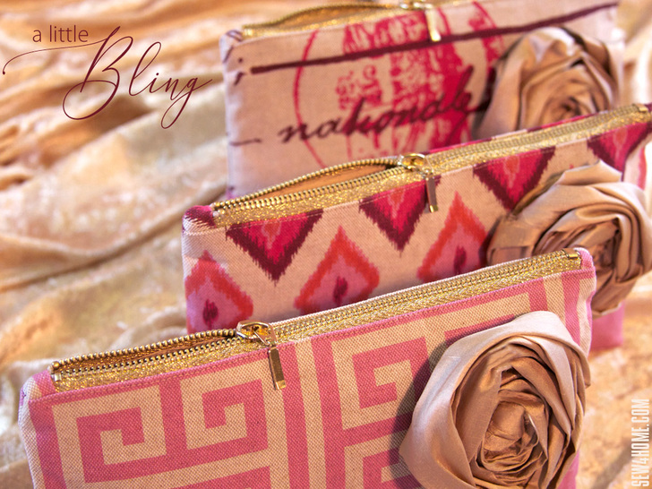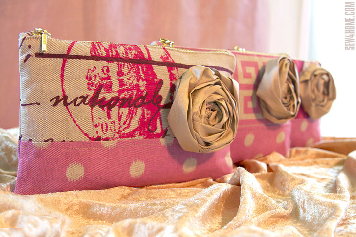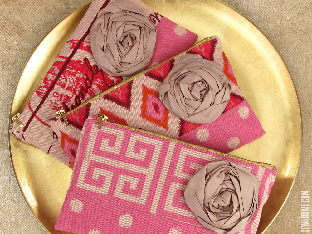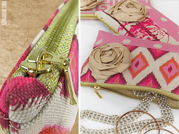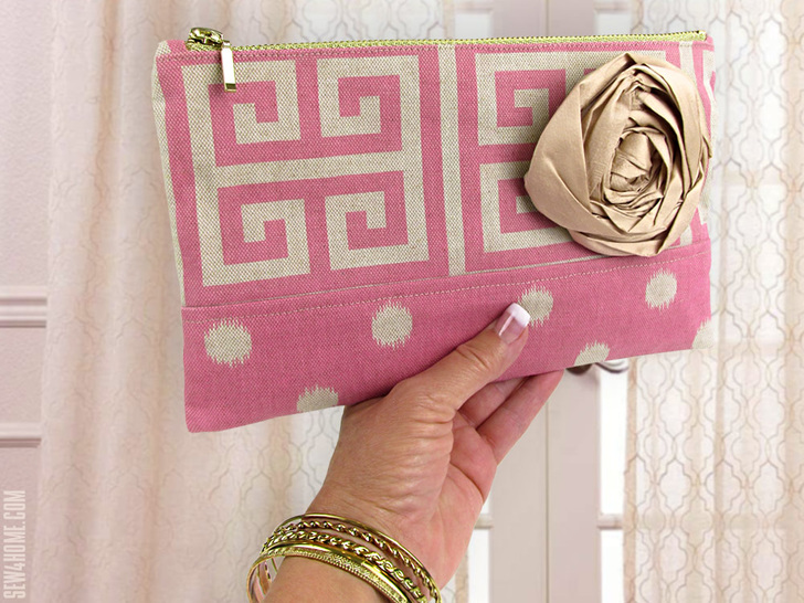 A classic zippered clutch is great for all types of situations. How you blend your fabrics, notions, and embellishments is what defines the finished style – from everyday casual to evening elegance. We’re working in elegance category for this project, showing you how to combine two boldly graphic exterior fabrics with the rich texture of silk dupioni for the lining and the unique rolled rose that adorns the front. We topped it off with a chunky, metallic zipper for a bit of bling.