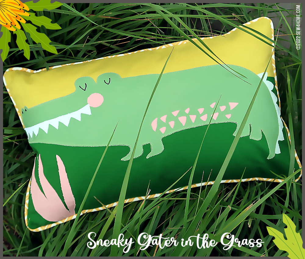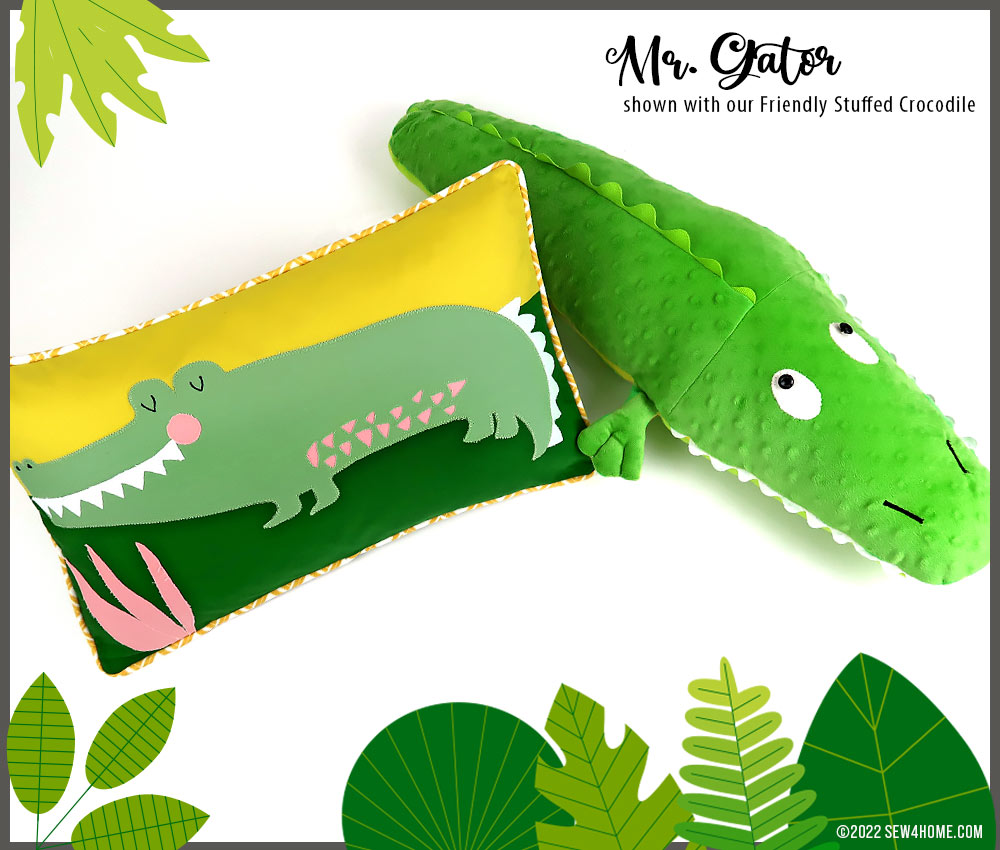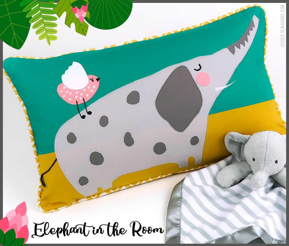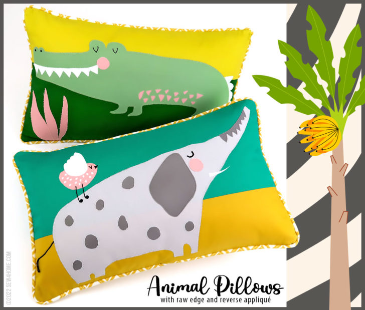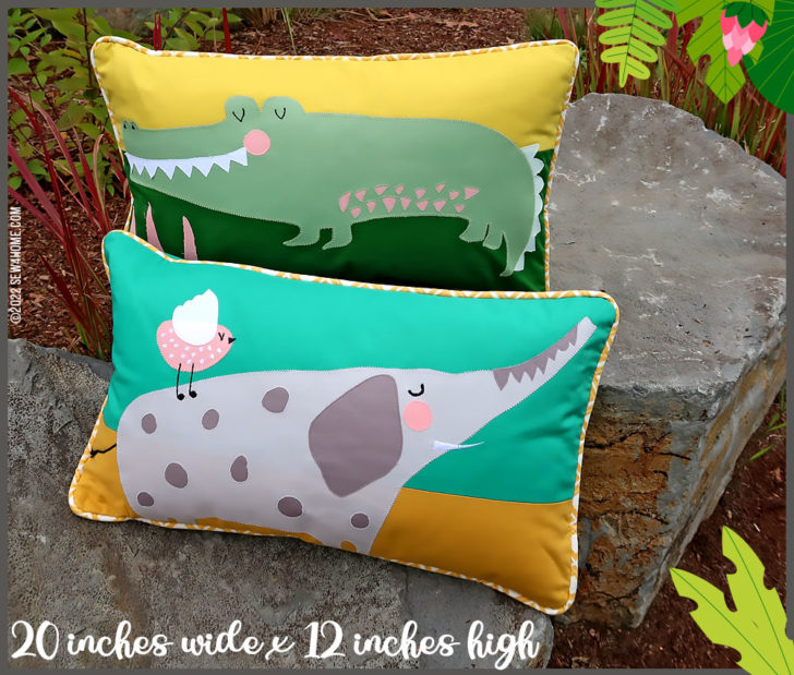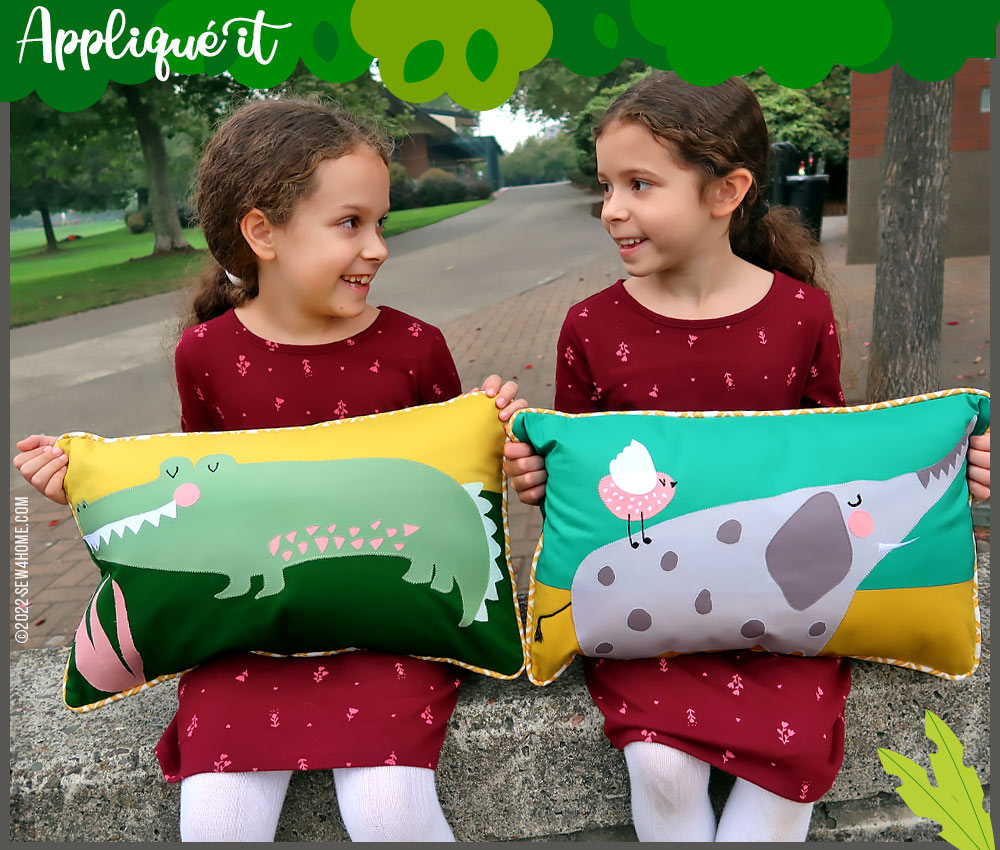 The call of the wild! This adorable pillow pair features a Gregarious Gator and an Amiable Elephant. You’ll find all the steps below to place them on 20” x 12” lumbar pillows using three different appliqué techniques: outline and stitch, raw edge, and reverse.