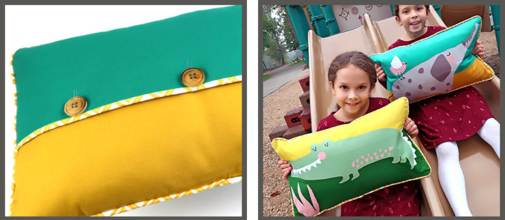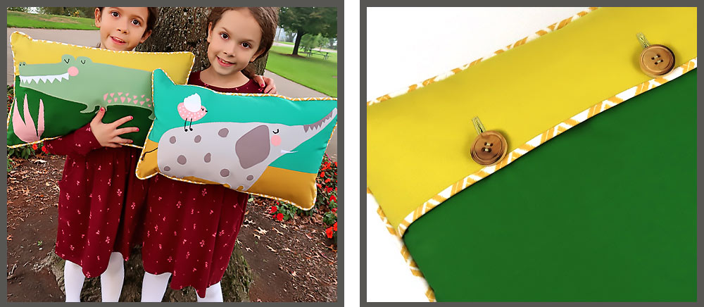 You’ll notice our clever critters sit on a two color background designed to simulate the Sky and Earth, giving a bit of perspective and depth to the two-dimensional surface of a pillow. These colors are echoed on the back of each pillow with a classic overlapping button closure. The back panels also feature a horizontal binding in the same fabric used to create the custom perimeter piping. It’s S4H, so you know we have full instructions for all these accents, including links to additional how-to tutorials if you’re brand new to piping or buttons and buttonholes.