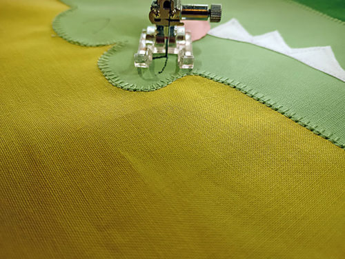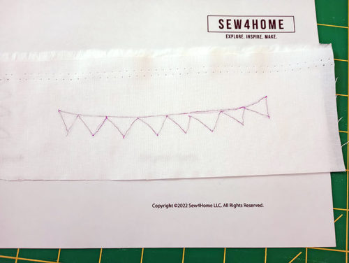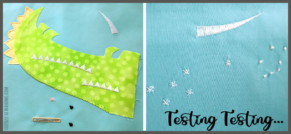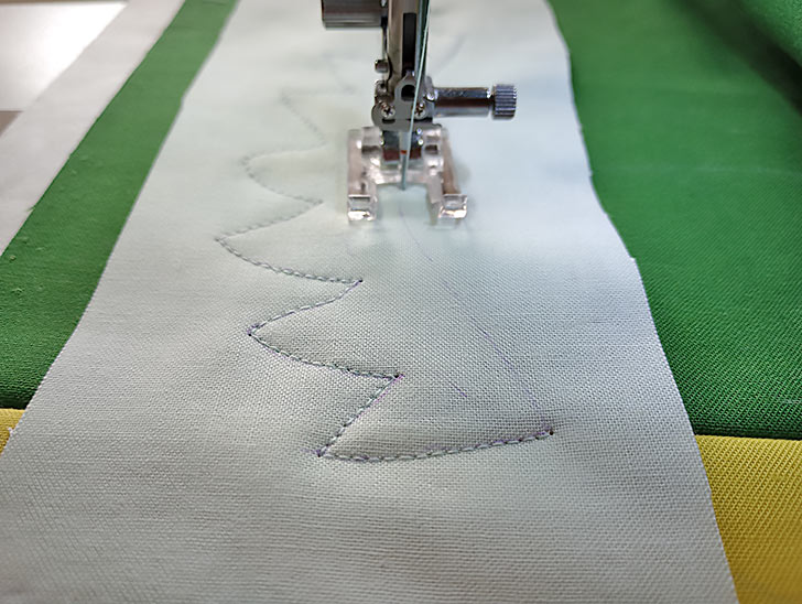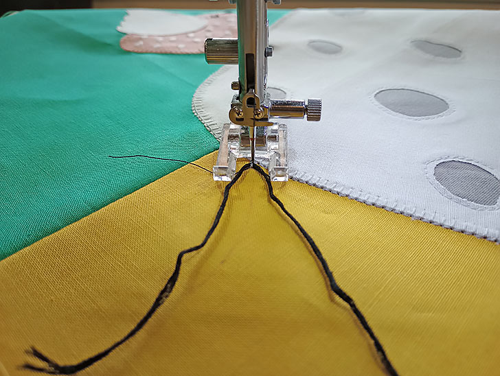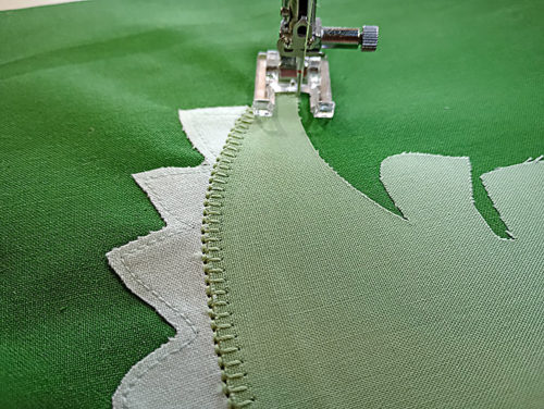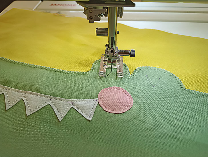 - … covered with a narrow zig zag (we used 1.0 width and 0.30 length) for the Alligator’s Eyes, carefully following the drawn curved lines. This double-stitching technique traps the thread ends behind the zig zag for a super clean finish.