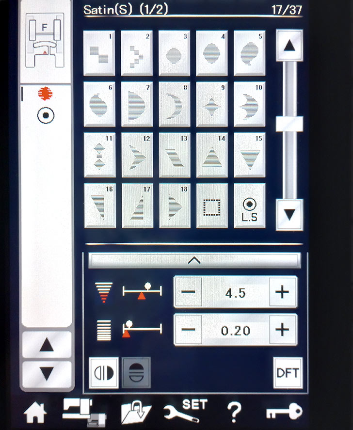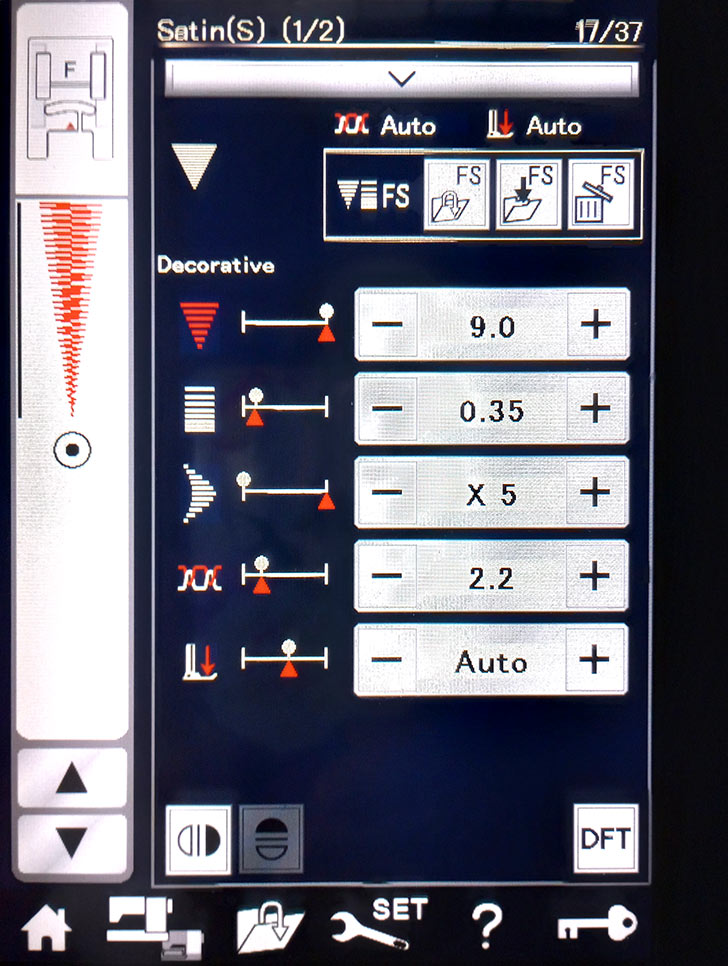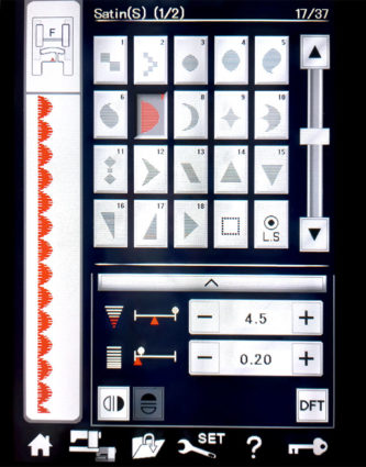 - The Bird Wing is done with raw edge appliqué, and the Spots on its Body are formed by adjusting a single roundish Satin Stitch adjusted to 4.5 stitch width and 0.20 stitch length. The image below shows how we programmed out Janome machine to create a single adjusted stitch pattern, knot off, and cut.