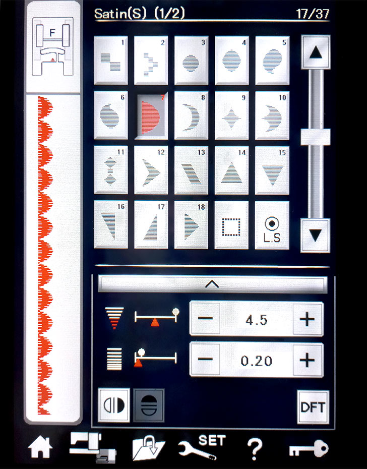 - The Nostrils were formed by adjusting a single Decorative Half Scallop Satin Stitch to a 4.5 stitch width and 0.20 stitch length. The image below shows our actual stitch selection.