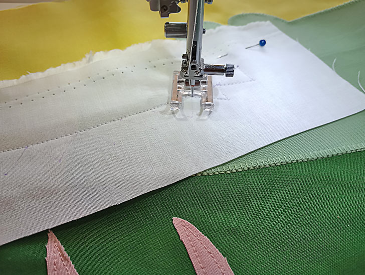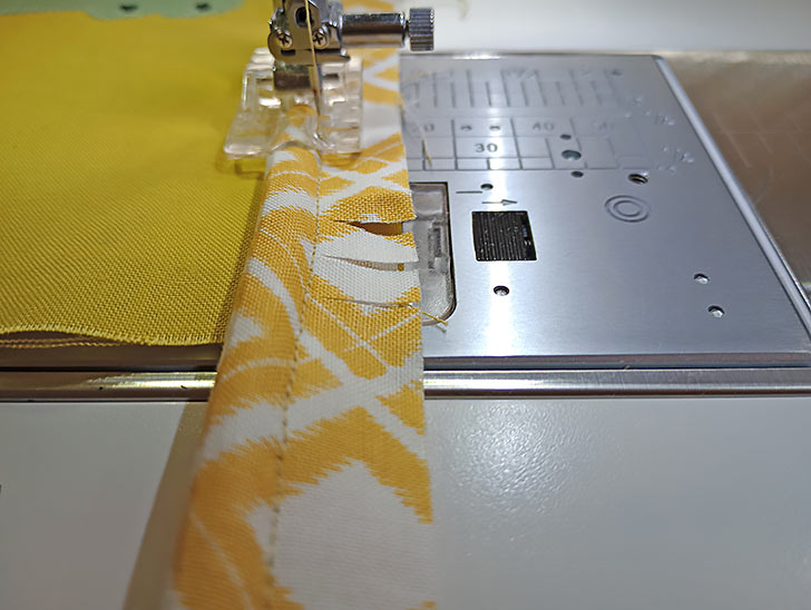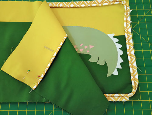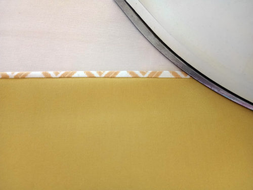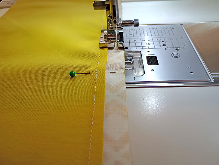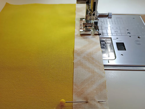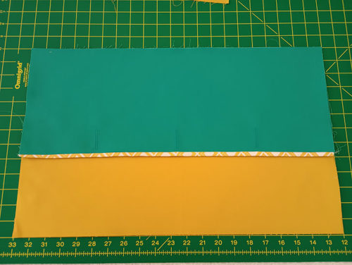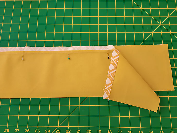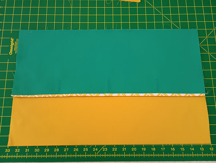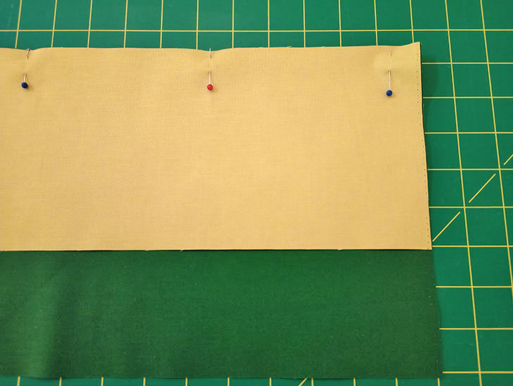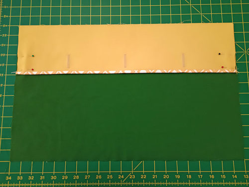 - Place the two overlap panels right sides together, aligning the top raw edge of the binding strip with the top raw edge of the interfaced panel. Pin together.