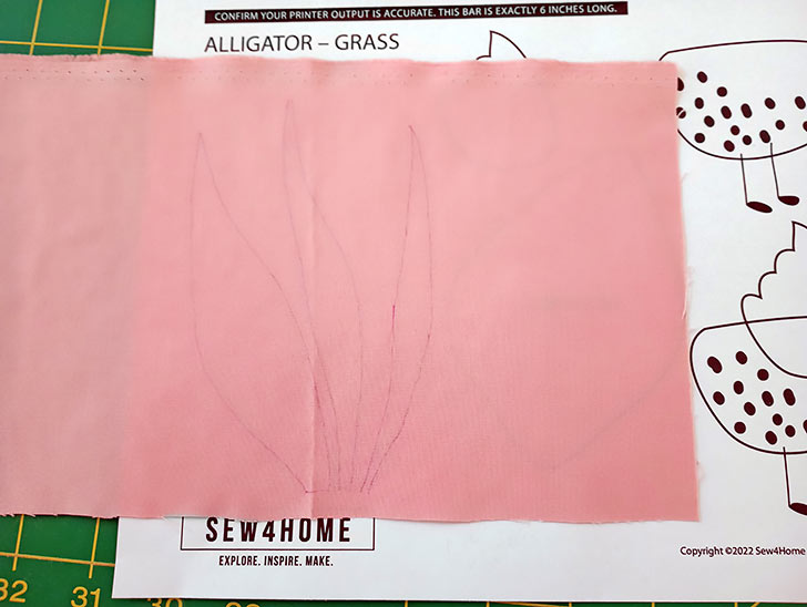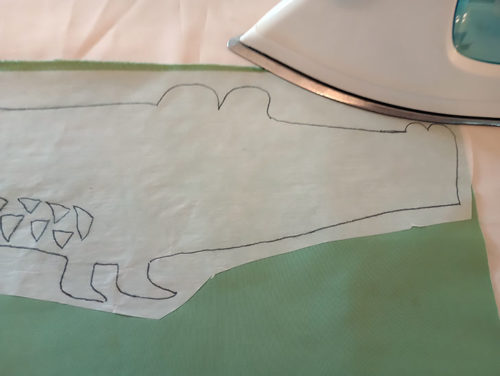 - Find the fabric for the Alligator’s body (Celadon in our sample). Place the Alligator outline onto the right side of the fabric, fusing side down – drawn image up. Following manufacturer’s instructions, fuse in place.
